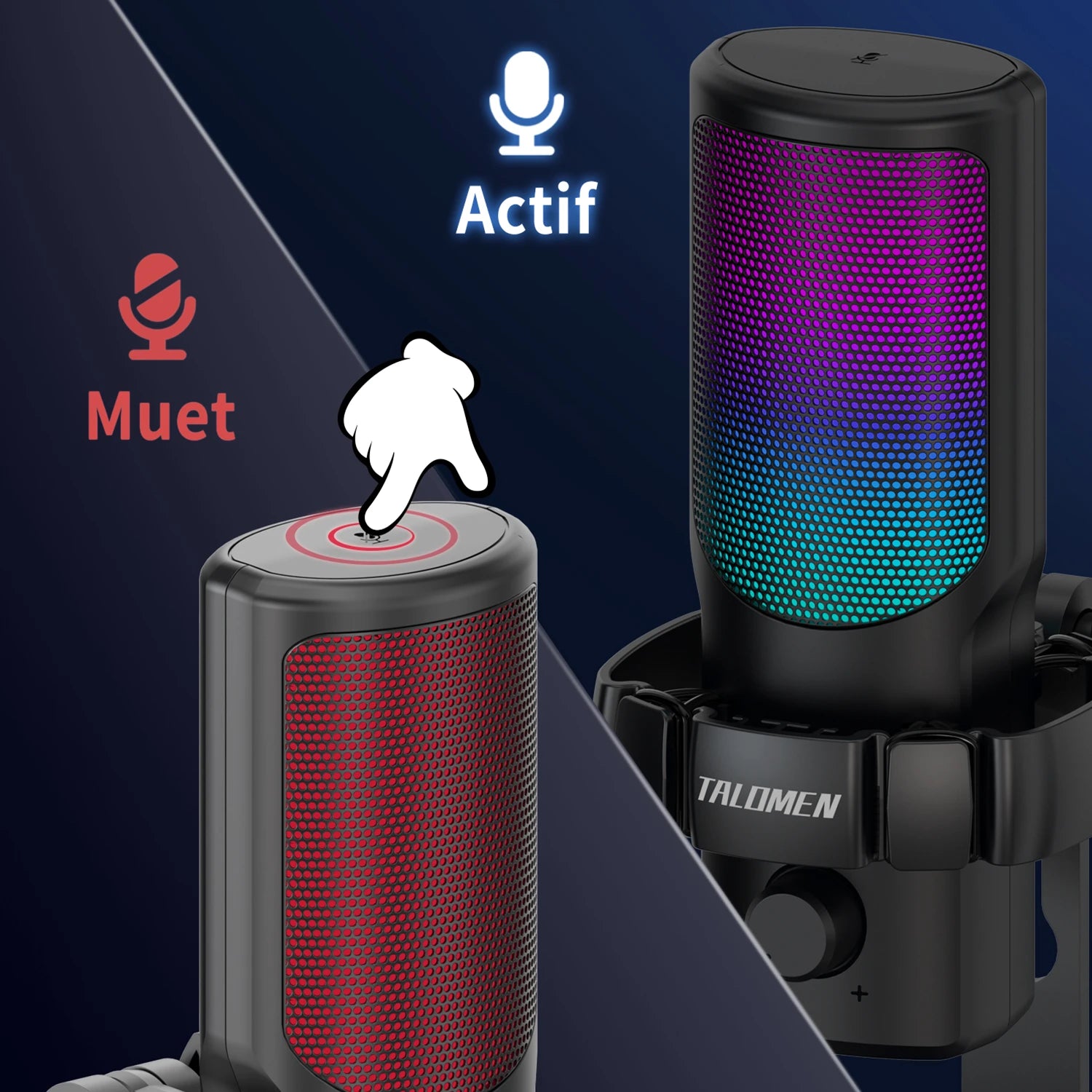 Le micro de jeu USB Talomen est doté d'un éclairage RVB vibrant avec sept modes de couleur, créant une atmosphère de jeu immersive. Ce microphone de studio de jeu comprend une fonction de mise en sourdine rapide tactile ; une simple pression sur le bouton coupe le microphone, de sorte que vous savez toujours quand il est coupé, ce qui permet d'éviter toute interruption inattendue pendant les flux ou les jeux.