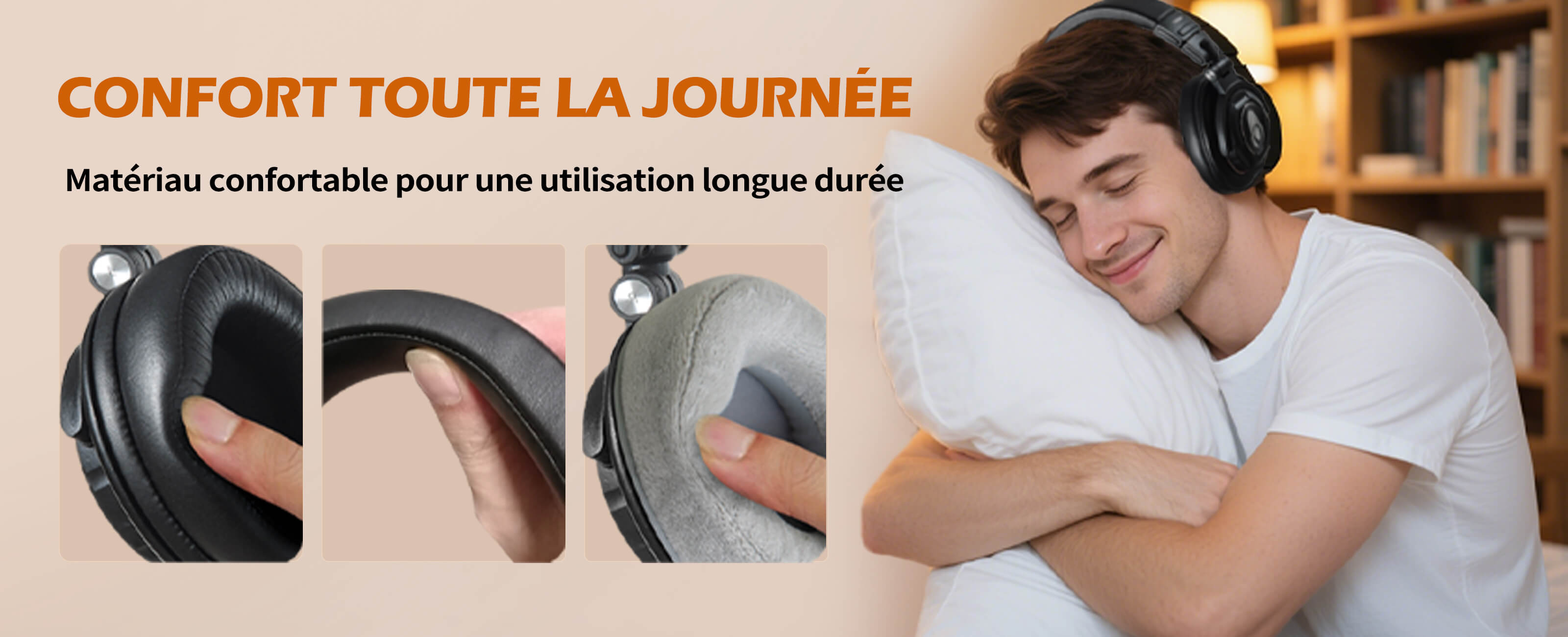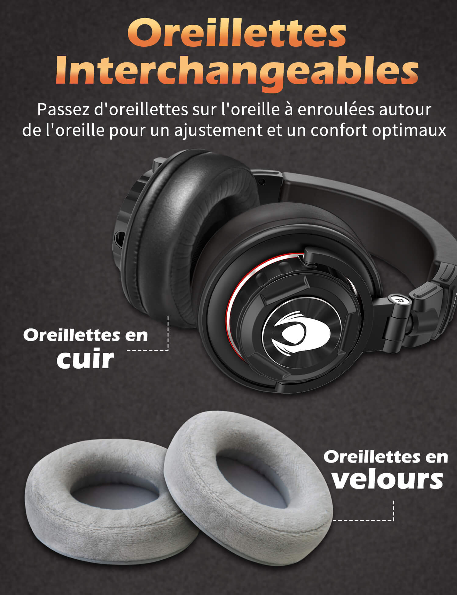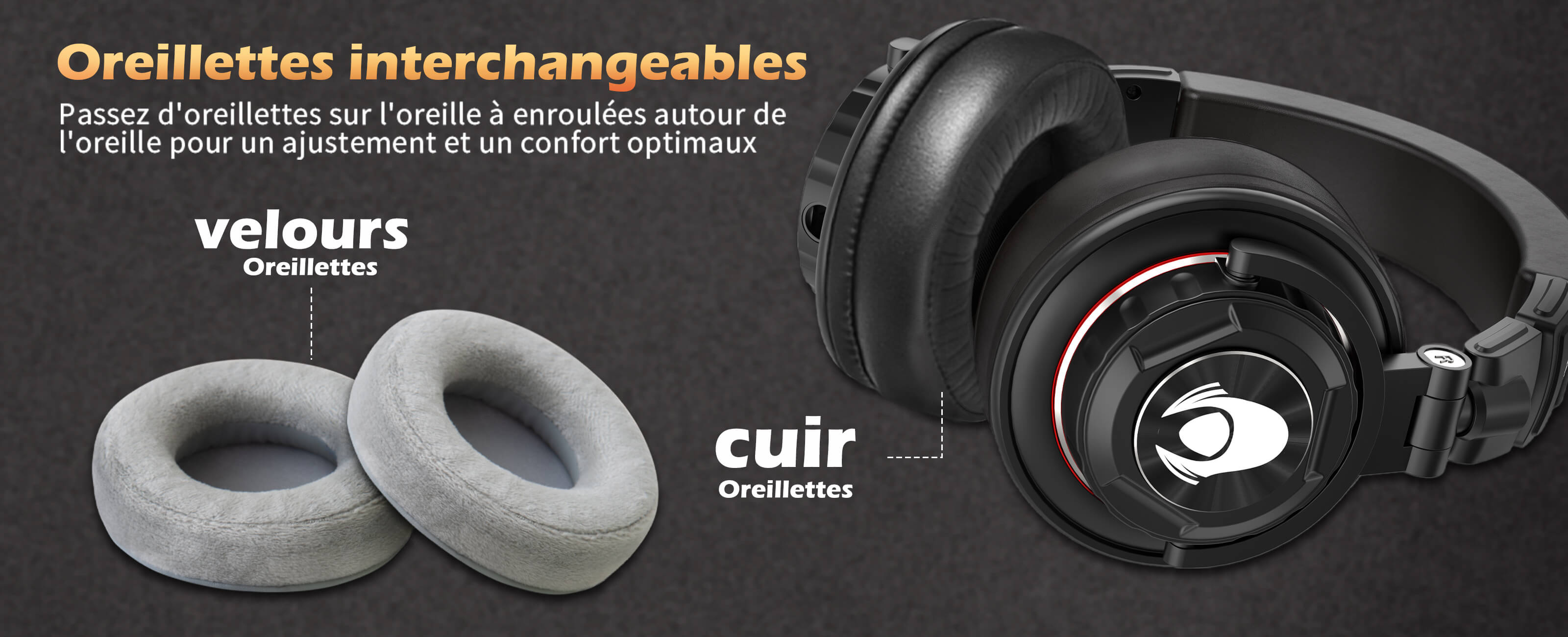 Cache-oreilles en cuir et velours : Les cache-oreilles en cuir sont délicats au toucher, s'ajustent parfaitement et offrent une sensation enveloppante et une excellente isolation phonique. Les cache-oreilles en velours remplaçables sont doux et respirants, aussi légers qu'un nuage, avec une surface en velours fin et agréable au toucher.