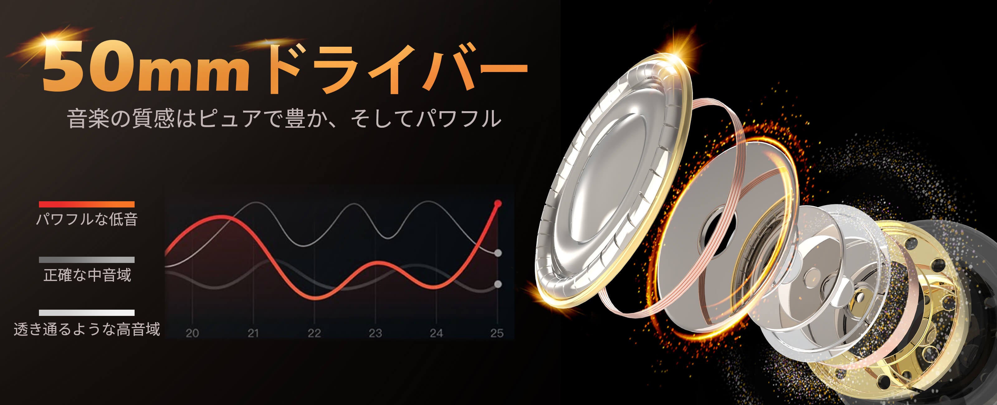 一般的なフェライト磁石の代わりに高性能ネオジム磁石を採用することで、音のレスポンスが速くなり、ダイナミックレンジが広がり、歪みが低減します。高忠実度と高感度を実現し、音楽の最もリアルな響きを再現します。