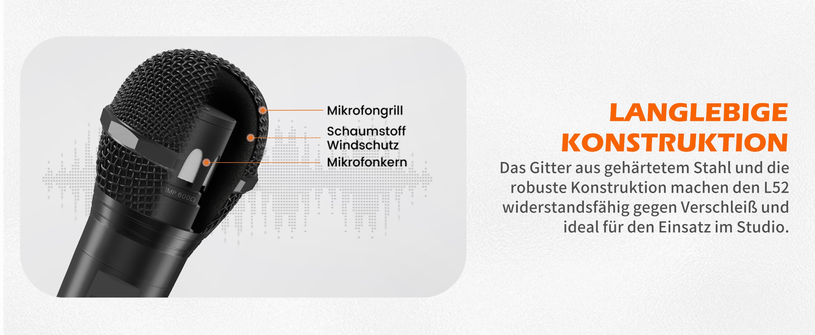 Das Talomen L52 ist ein dynamisches Mikrofon mit Supernierencharakteristik, das mit zwei Audiokabeln geliefert wird und mit allen Mikrofonen mit 6,35-mm-Eingängen und XLR-Eingängen kompatibel ist. Die Black Badge-Version ist in mattschwarzem Metall ausgeführt.