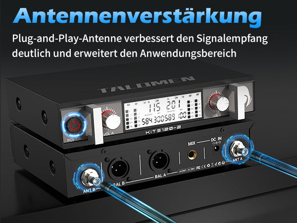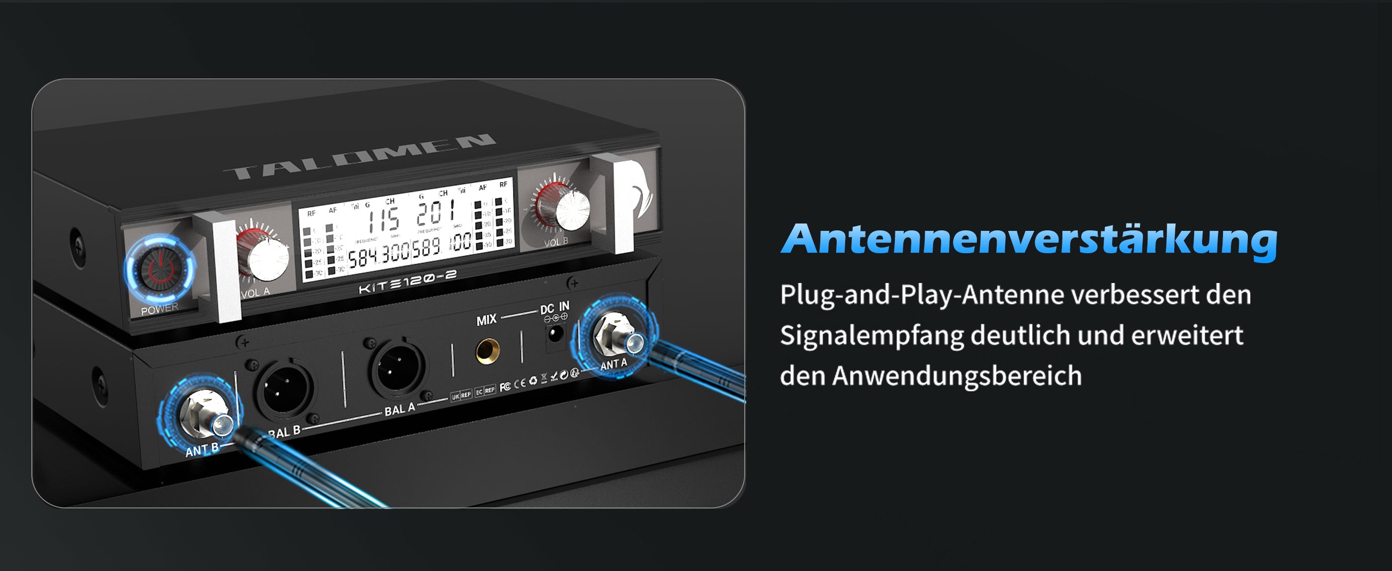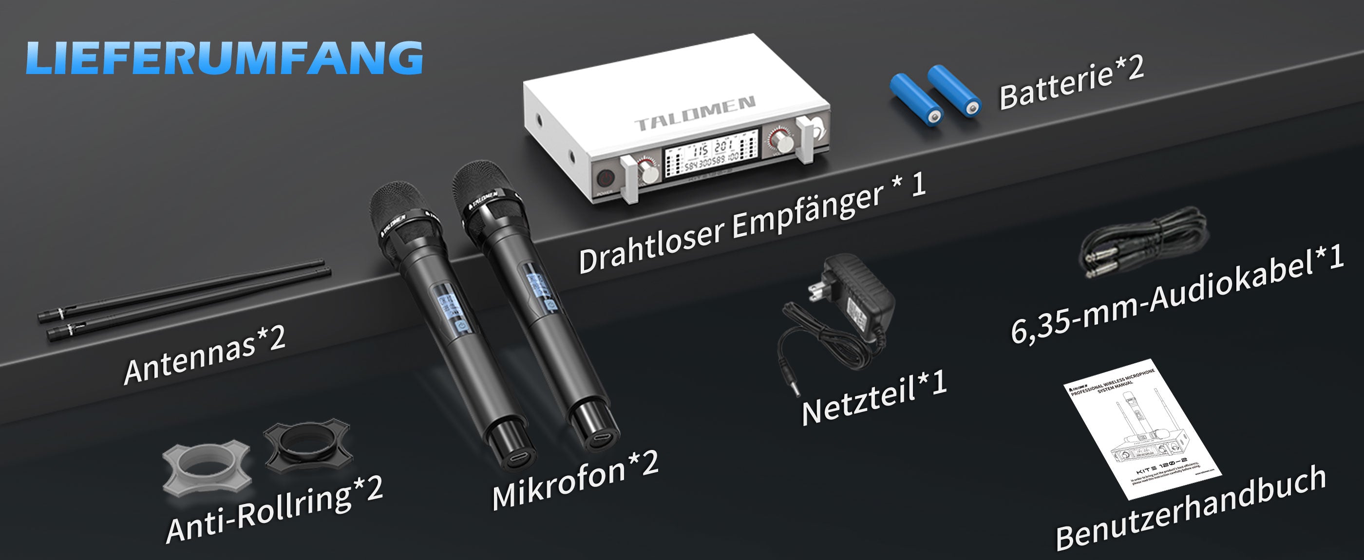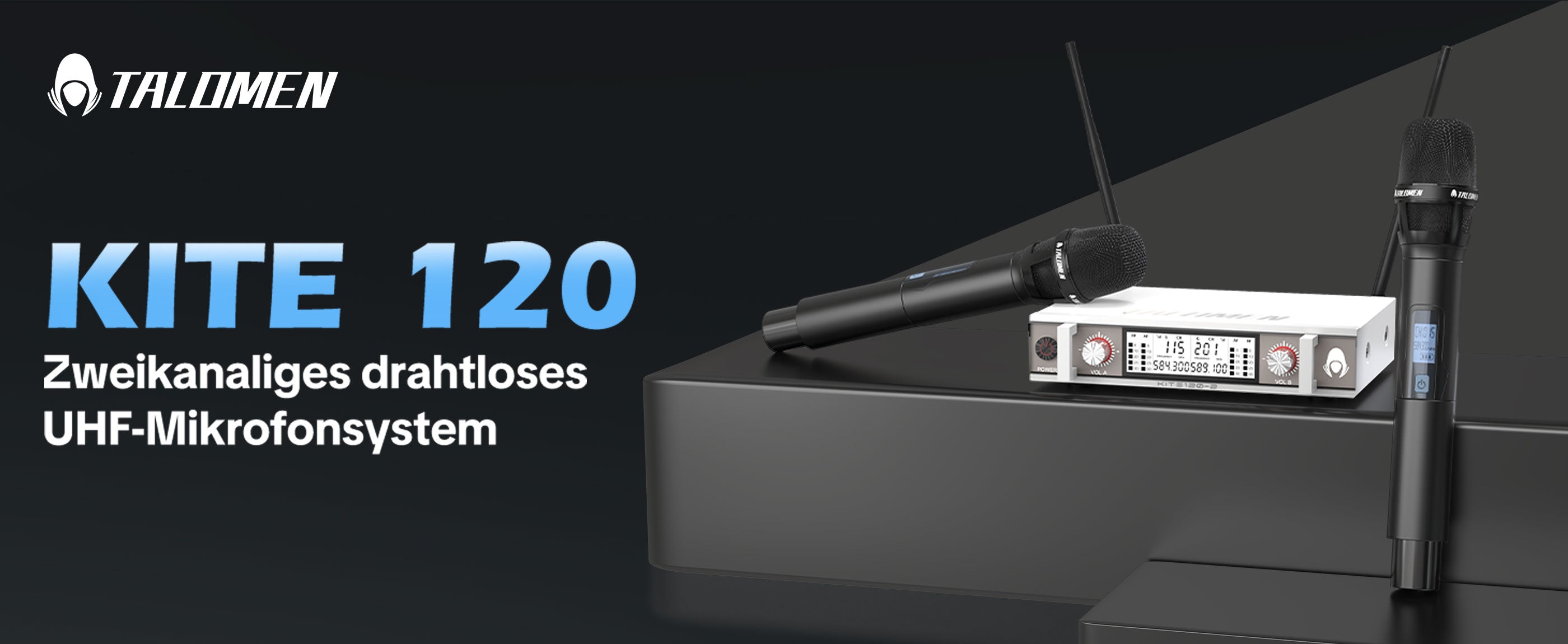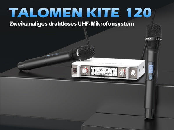 Das Talomen K120 ist ein drahtloses Zweikanal-UHF-Mikrofonsystem. Es umfasst einen Empfänger mit spezieller Antenne und zwei professionell abgestimmte dynamische Mikrofone. Es eignet sich perfekt für Gottesdienste, Karaoke-Abende, Hauspartys und mehr.