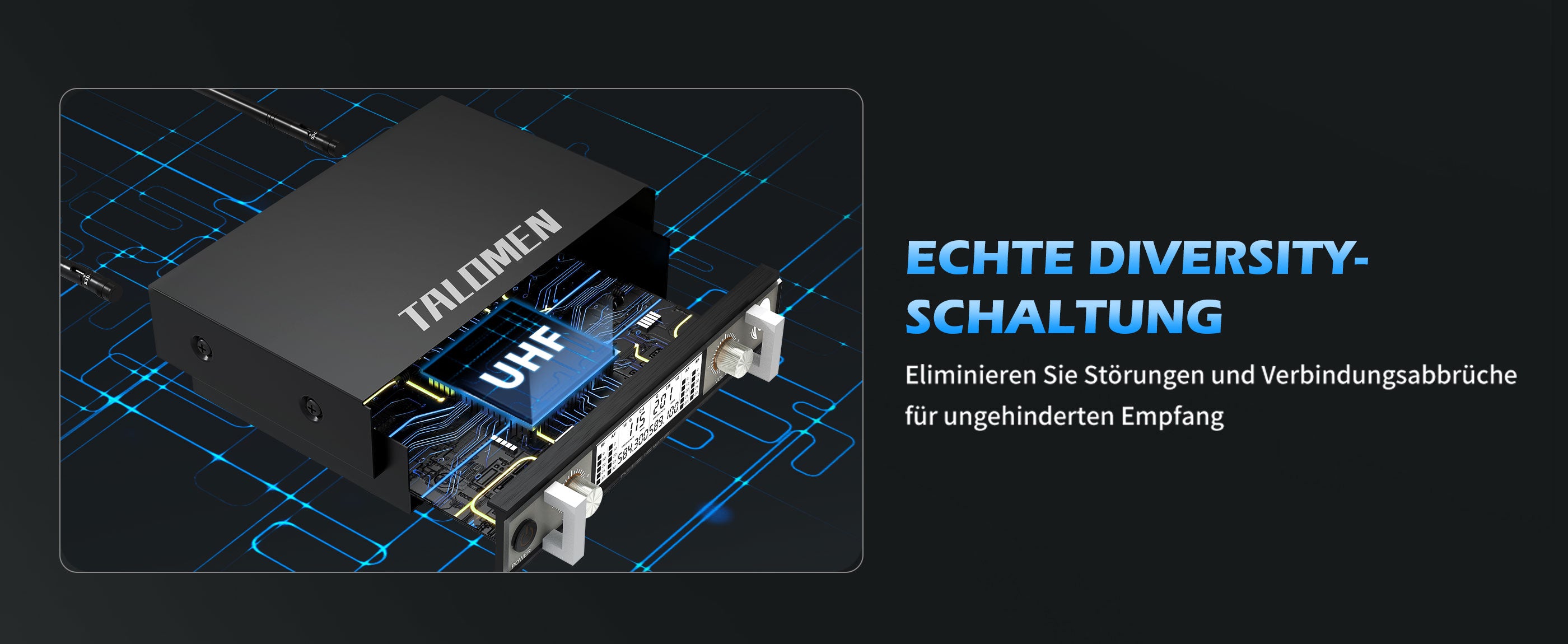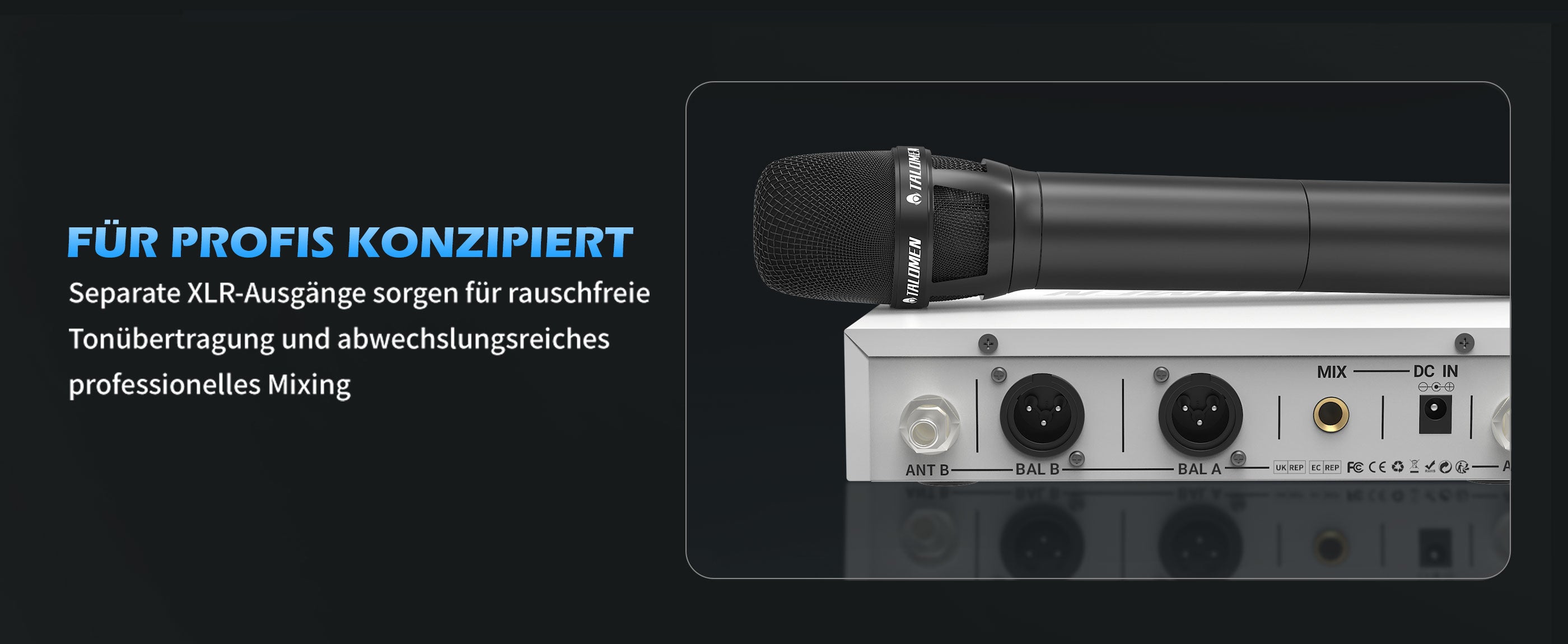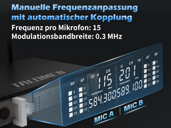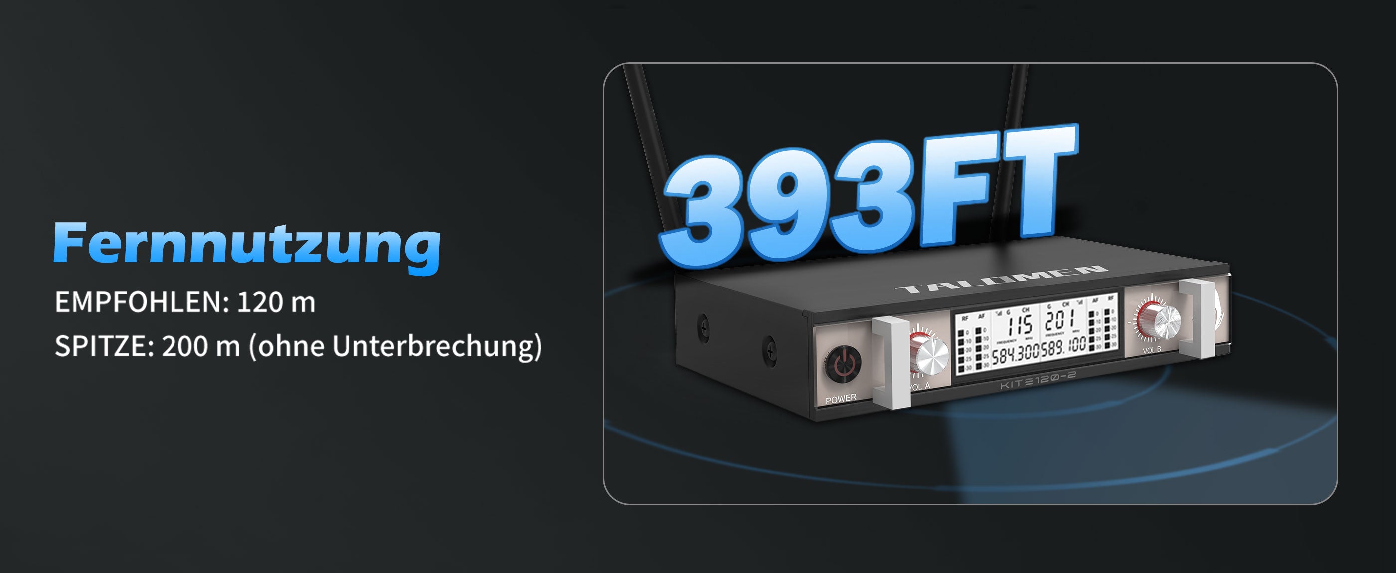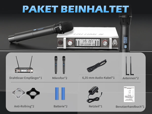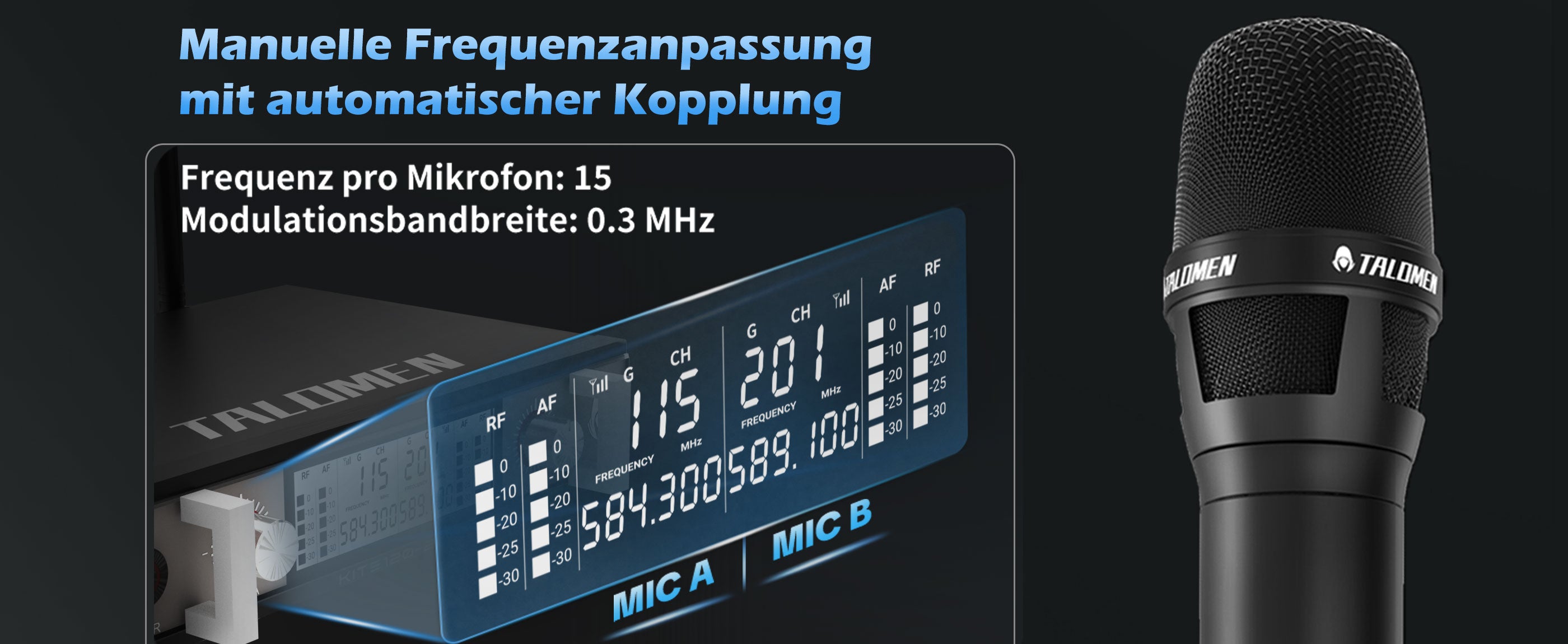 Das Talomen K120 ist ein drahtloses Zweikanal-UHF-Mikrofonsystem. Es umfasst einen Empfänger mit spezieller Antenne und zwei professionell abgestimmte dynamische Mikrofone. Es eignet sich perfekt für Gottesdienste, Karaoke-Abende, Hauspartys und mehr.