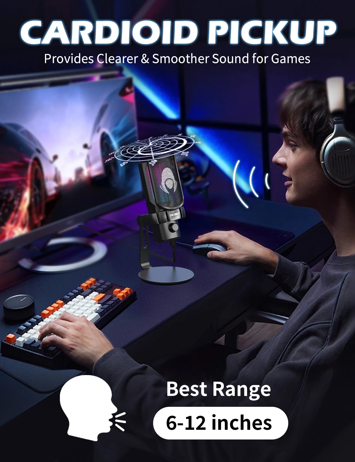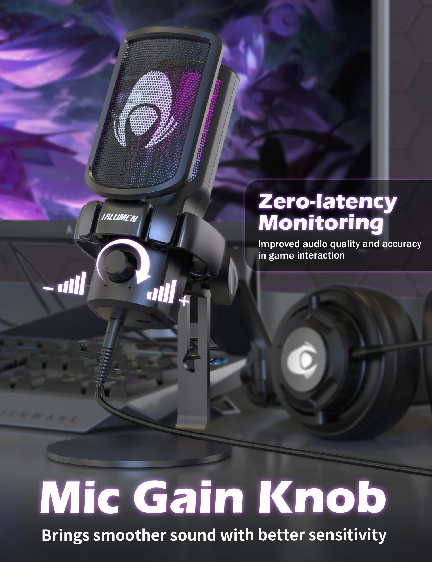 • 🏆Gradient RGB & Quick Mute - Talomen USB gaming mic features vibrant RGB lighting with seven color modes, creating an immersive gaming atmosphere. This studio microphone gaming includes a touch-sensitive quick mute; a simple tap mutes the microphone, so you always know when it’s muted, helping to avoid any unexpected interruptions during streams or games.